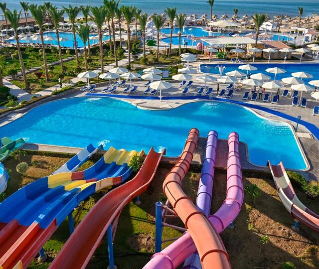 Hotel Sunrise Aster Aquapark Resort is een kindvriendelijk vakantieoord tussen de mondaine badplaats El Gouna en het bruisende Hurghada. Het kristalblauwe water van de Rode Zee ligt hier letterlijk aan je voeten dankzij het uitgestrekte privéstrand dat direct aan het hotel grenst. In de weelderige tuin pronken twee prachtige zwembaden met uitzicht op zee, waarvan één zelfs de vorm van een gezichtje heeft. Hier vind je ook een waterglijbanentoestel voor kinderen en een gezellige pool bar. Sportievelingen kunnen zich uitleven in het fitnesscentrum, op het beachvolleybalveld of met een potje tafeltennis. Tegen betaling kun je bovendien windsurfen of duiken in de betoverende onderwaterwereld van de Rode Zee.